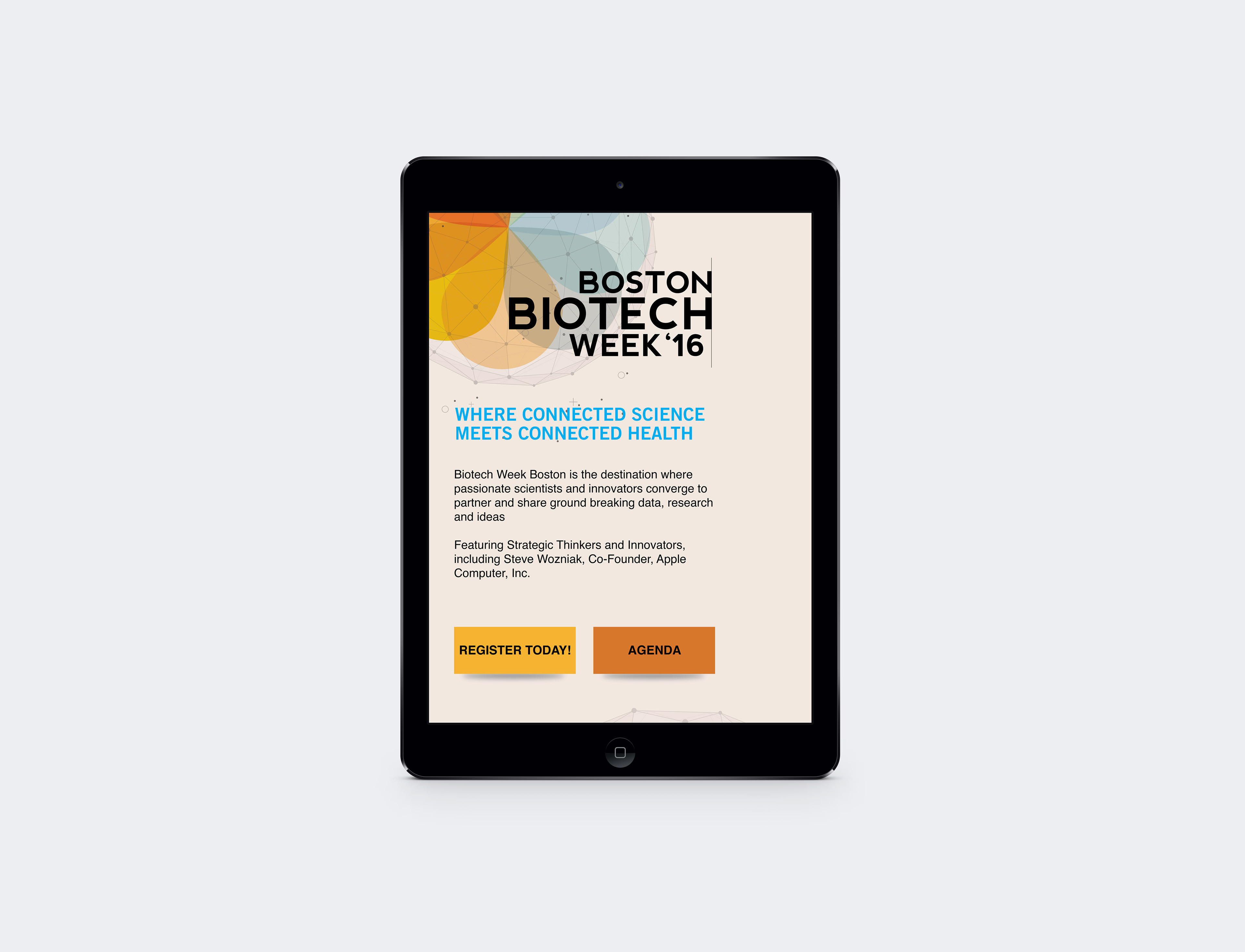 I was commissioned by IIR to come up with core creative for their new event Boston Biotech Week 2016. This event connects the science to the business of healthcare, and will bring together nearly 6,000 life science professionals to the Boston metro area, a huge life science hub for a span of 4 days of education, keynotes, workshops, and exhibit hall solutions. The target audience for this festival cuts across the life science spectrum including scientists, engineers, pharma marketers, digital health investors, drug delivery technologies, and various solution providers that support all areas of life sciences. I was asked to come up with a branded logo lockup, brochure cover and concepts for onsite signage as well as online graphics.