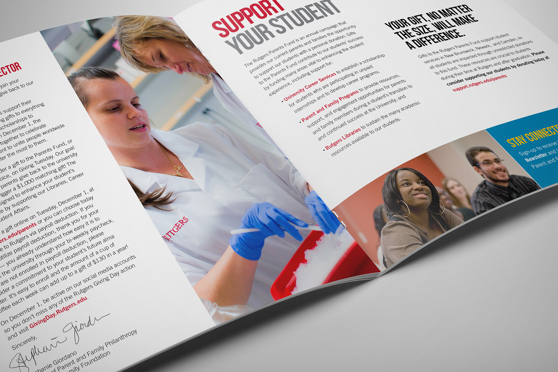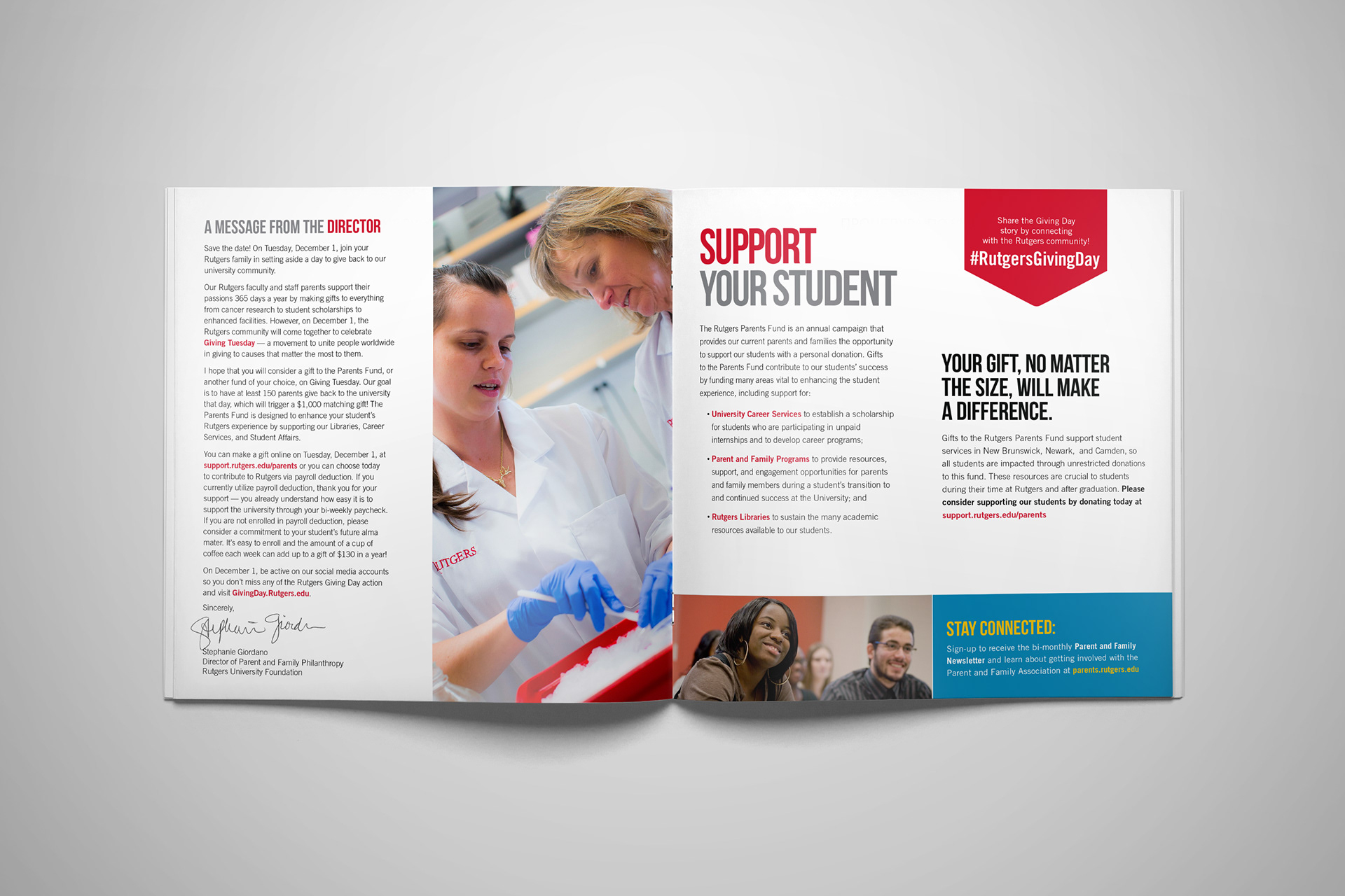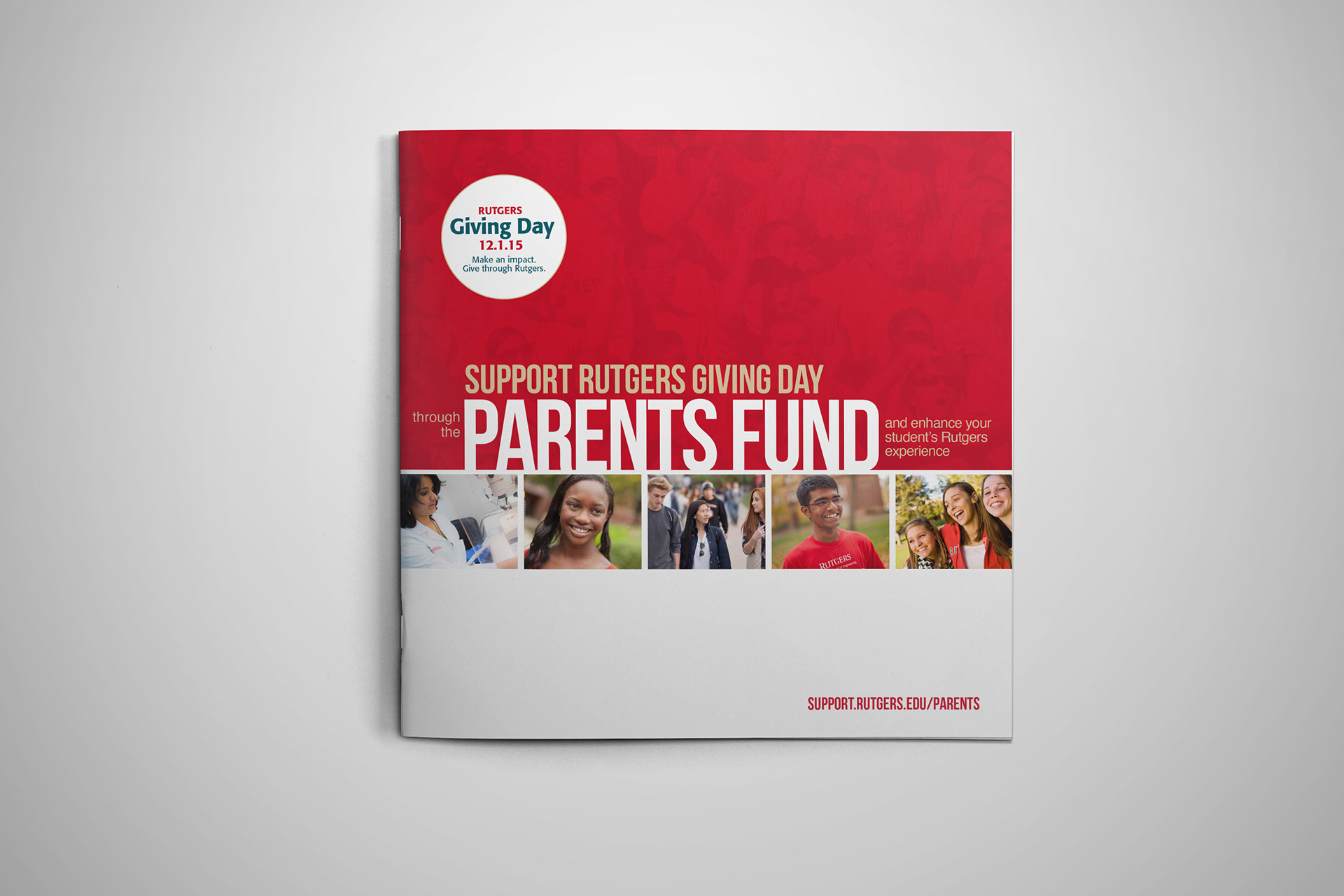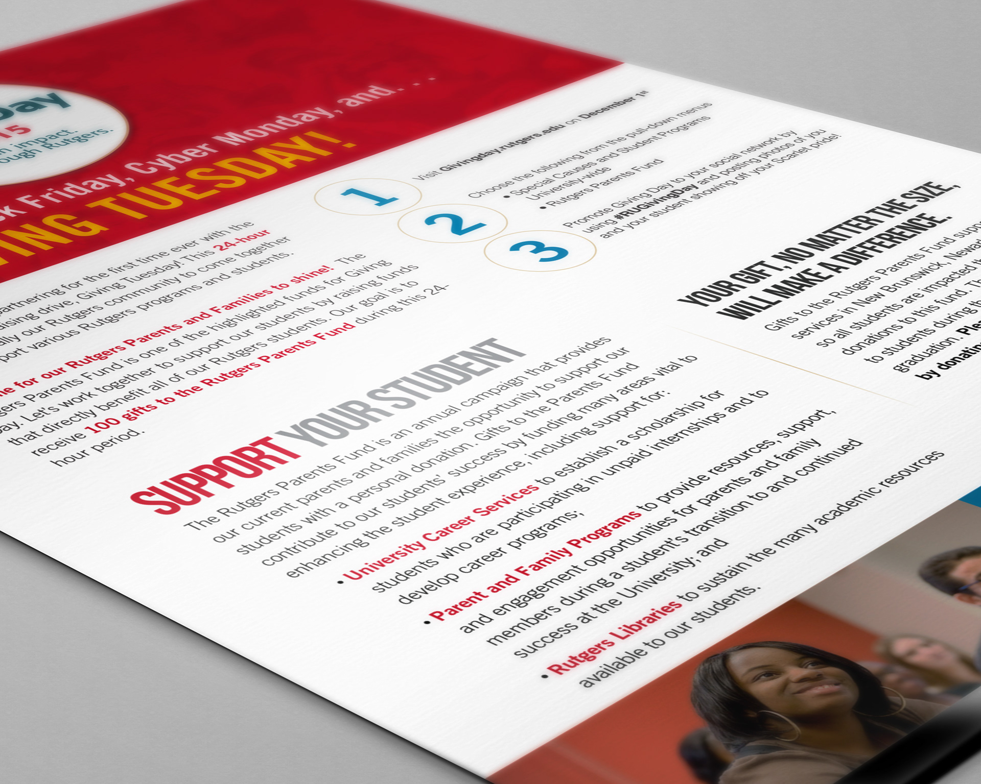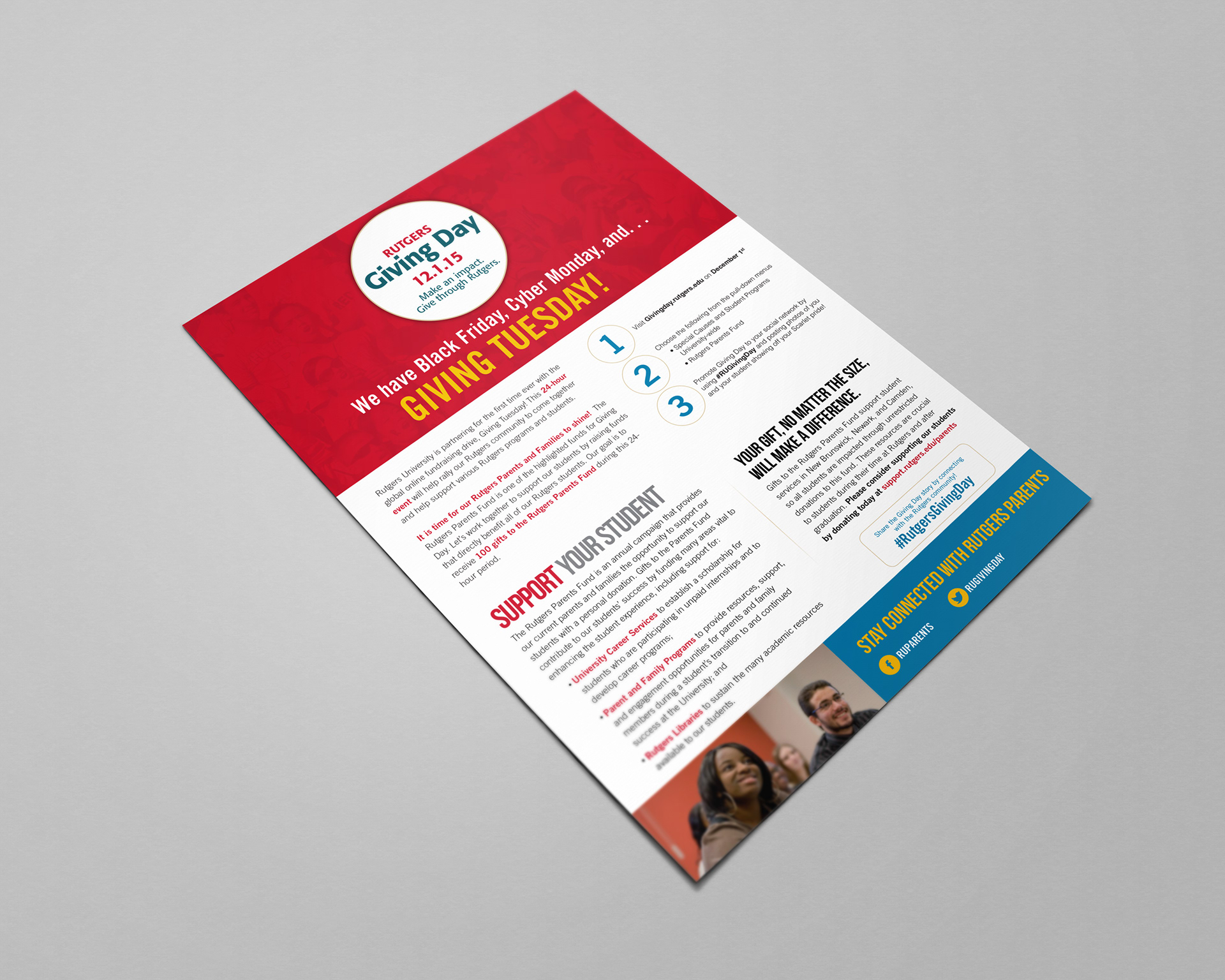 Promotional mailer for Rutgers Giving Day. This yearly event empowers Rutgers students, faculty, staff, alumni, parents and friends to take part in a daylong giving event dedicated to all things scarlet.